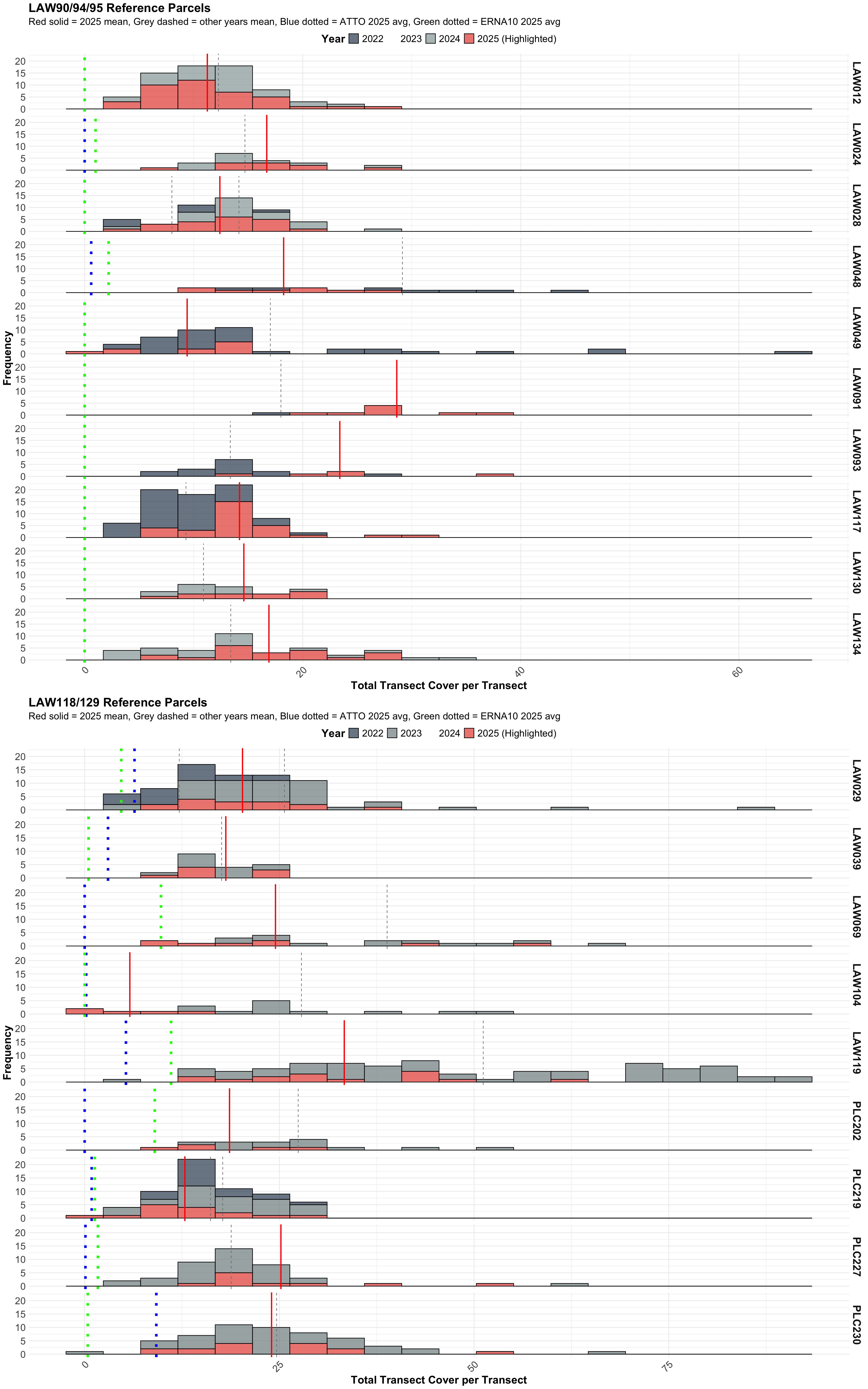 - **Group averages**: Averages calculated from ALL parcels in reference groups, including those with zero ATTO/ERNA cover